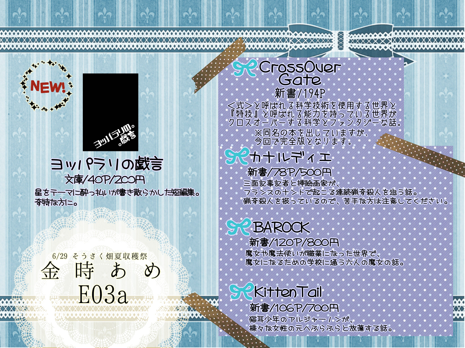 新刊ですが、コピー本が結構余ったので、今回は冊子印刷見送りにさせていただきました。期待していた方はすみません……。